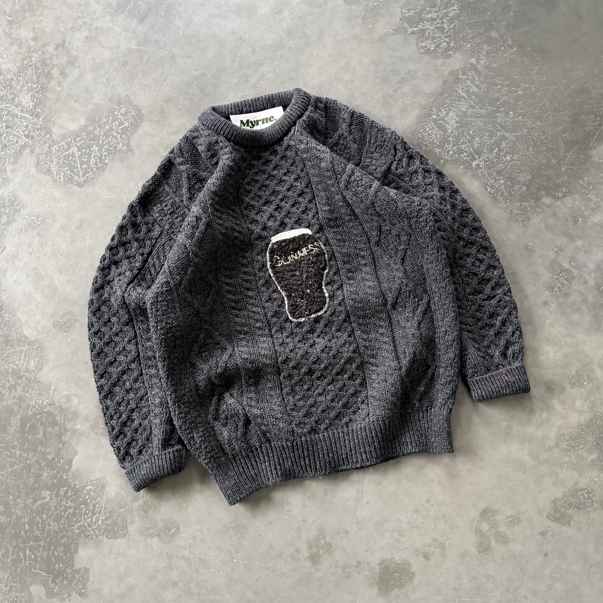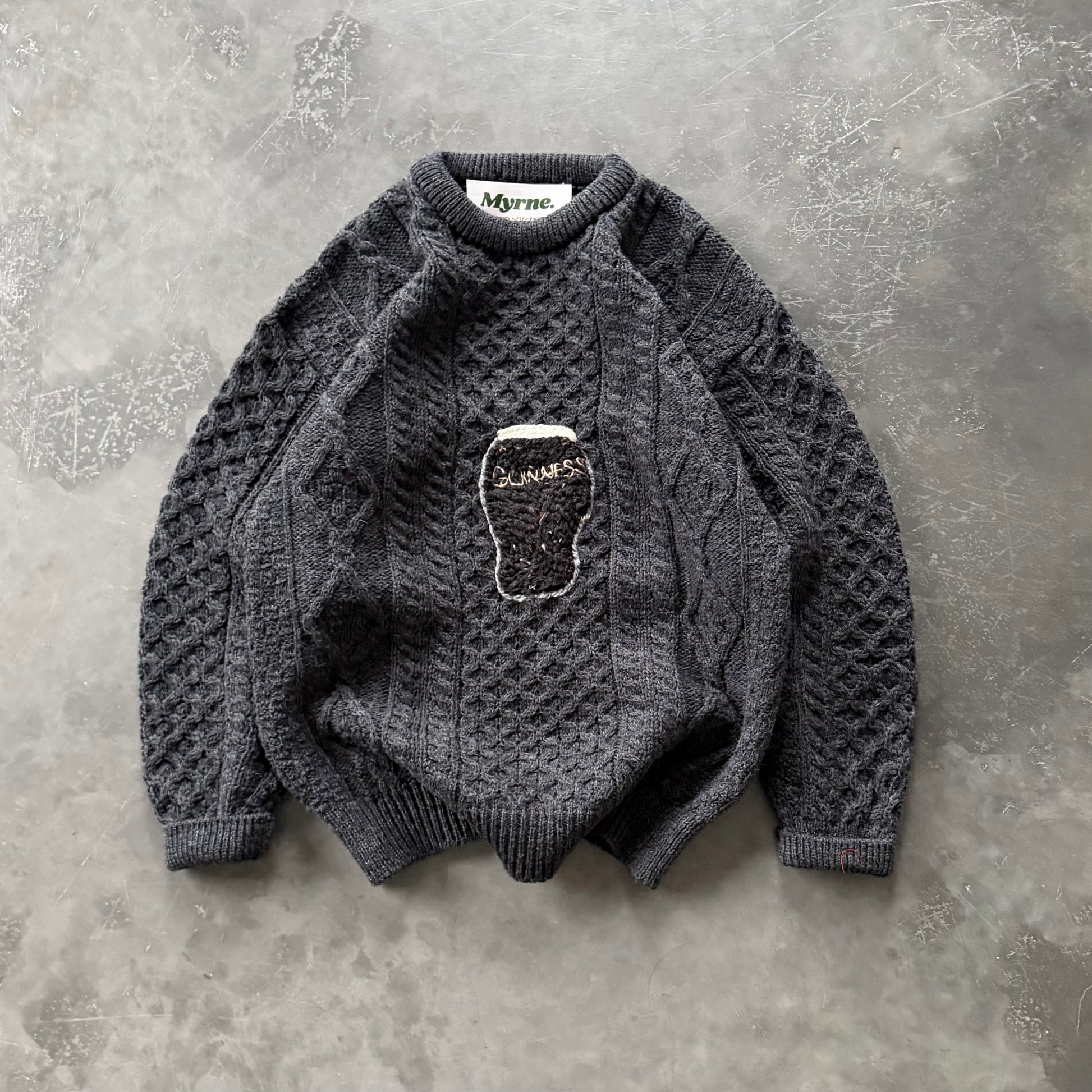 our pint geansaí’s are hand-embroidered by us onto 100% Aran wool sweaters. Each one is stitched by hand, no two are exactly the same.