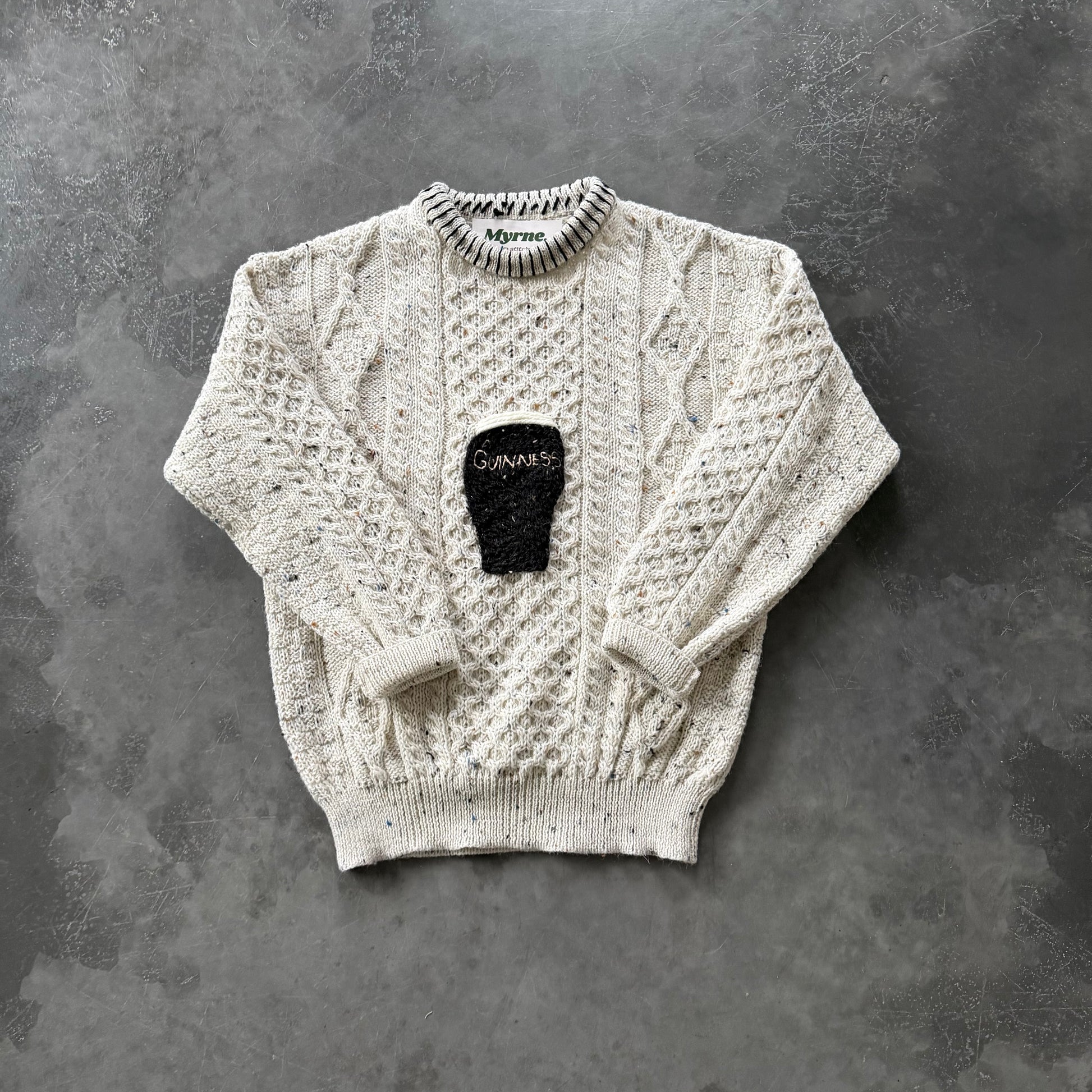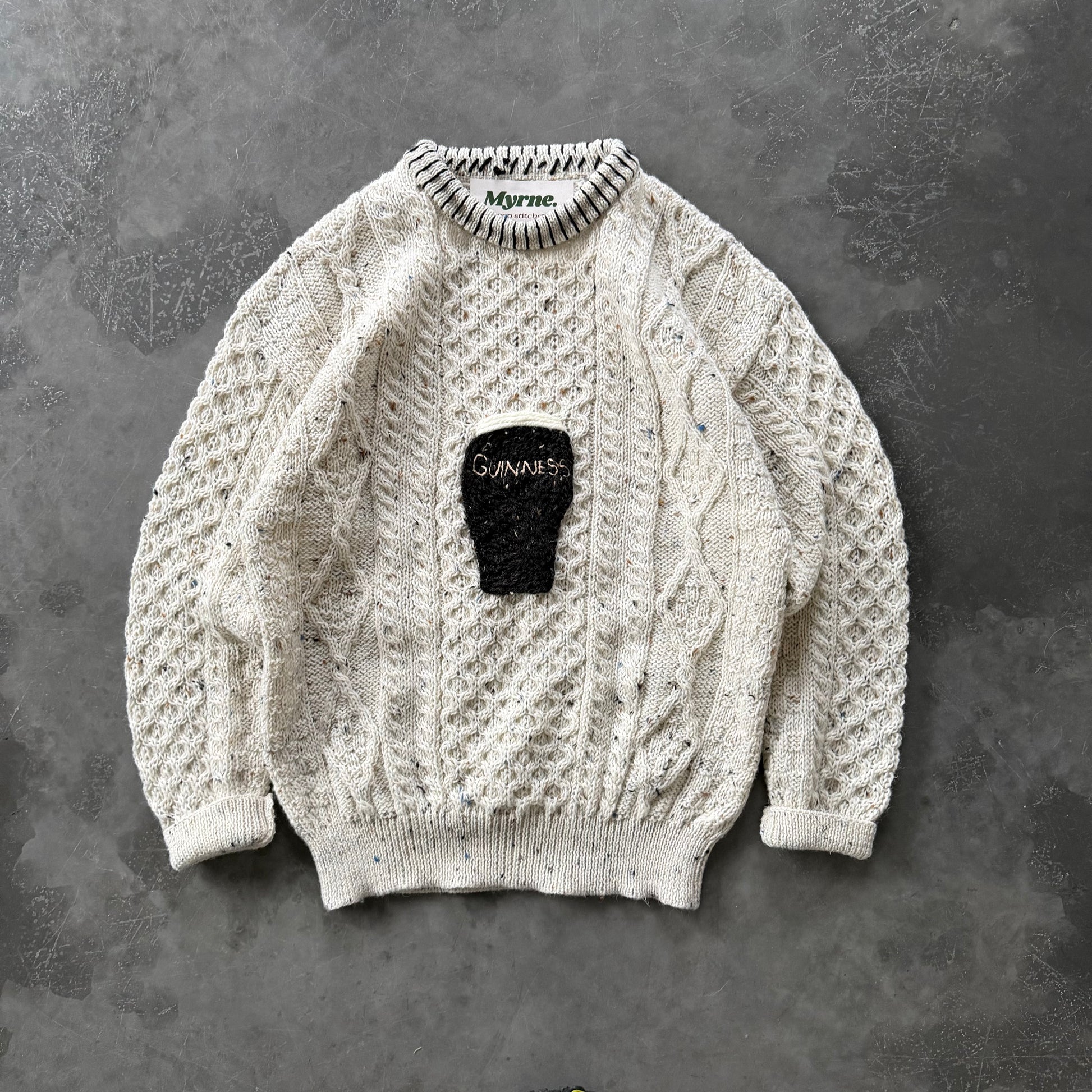 our pint geansaí’s are hand-embroidered by us onto 100% Aran wool sweaters. Each one is stitched by hand, no two are exactly the same.