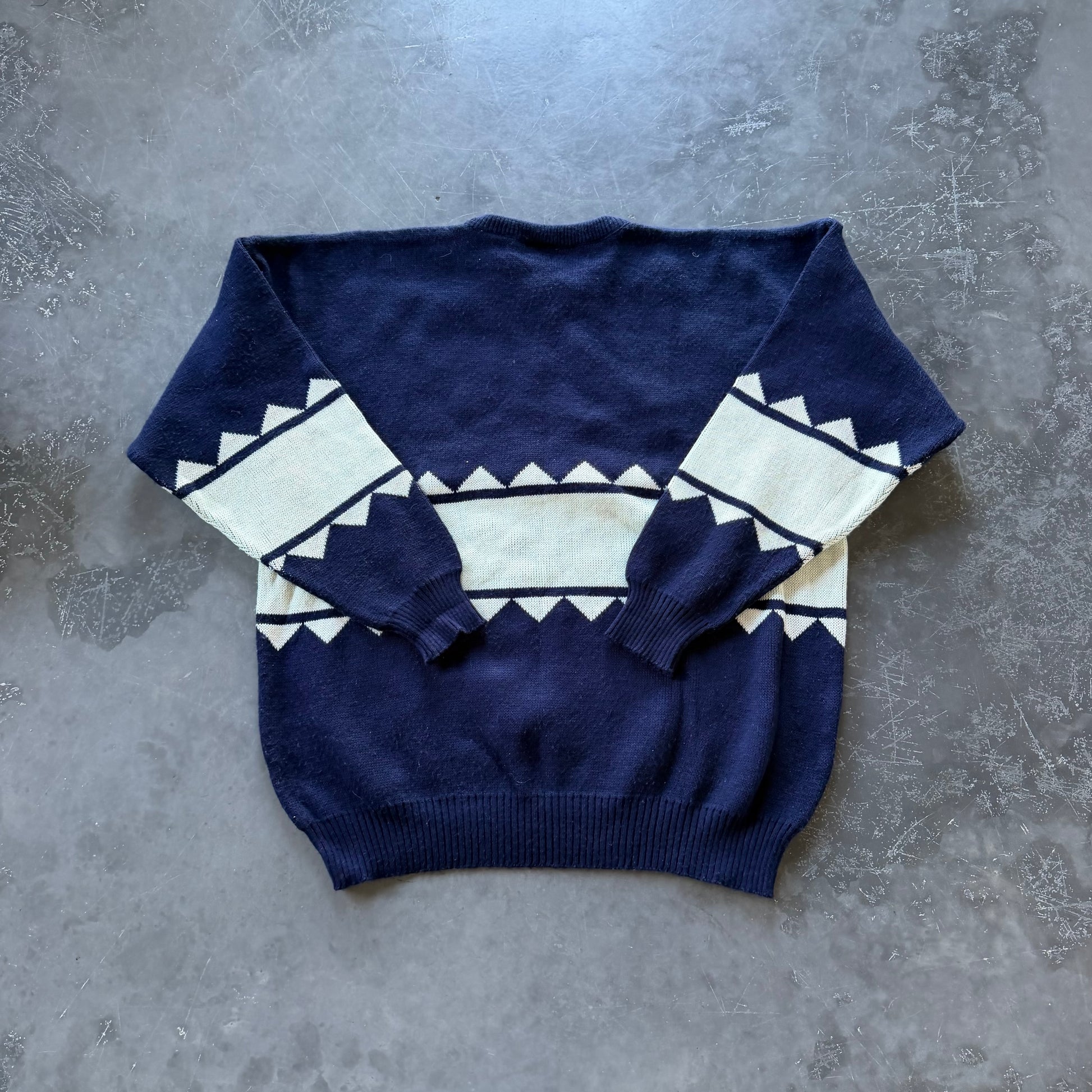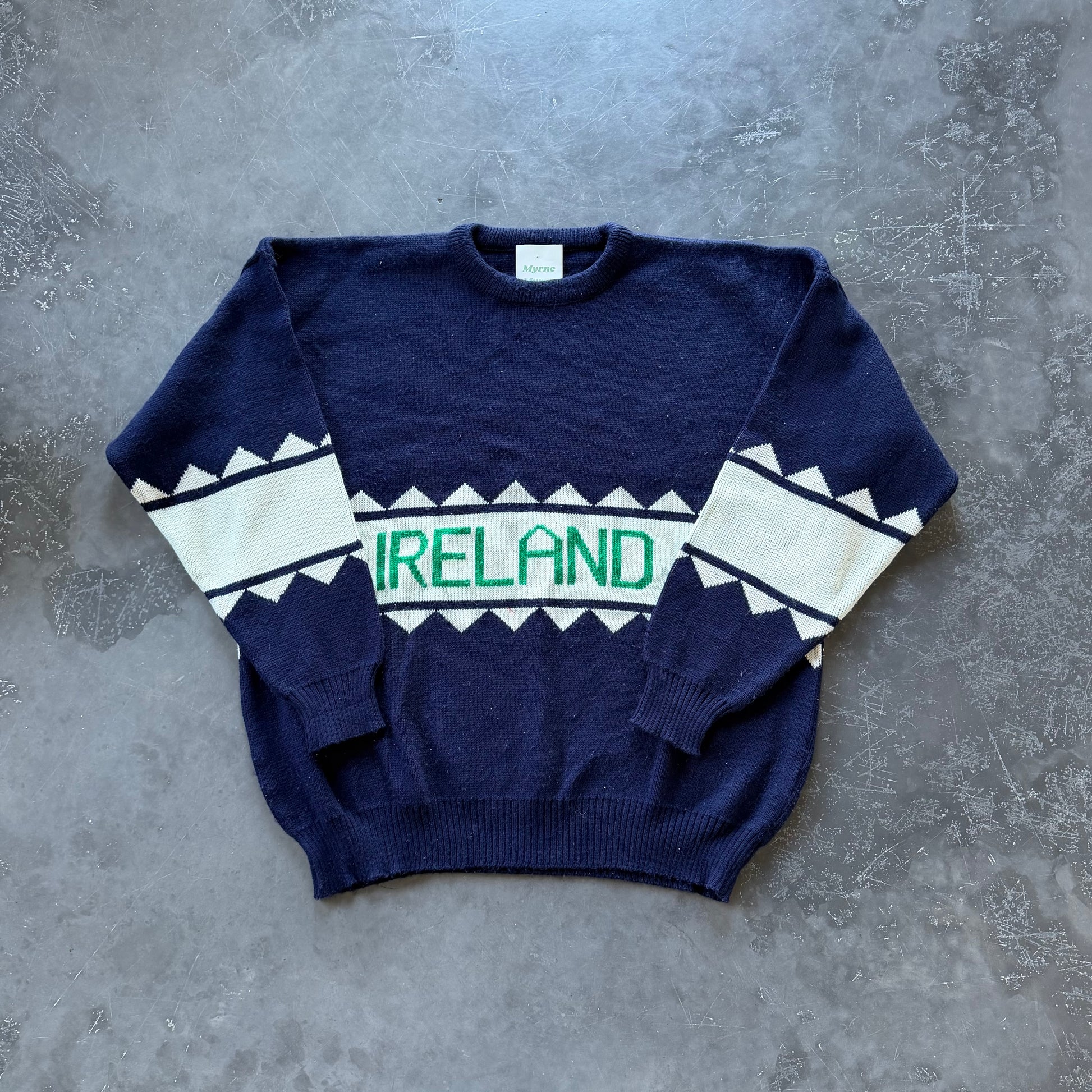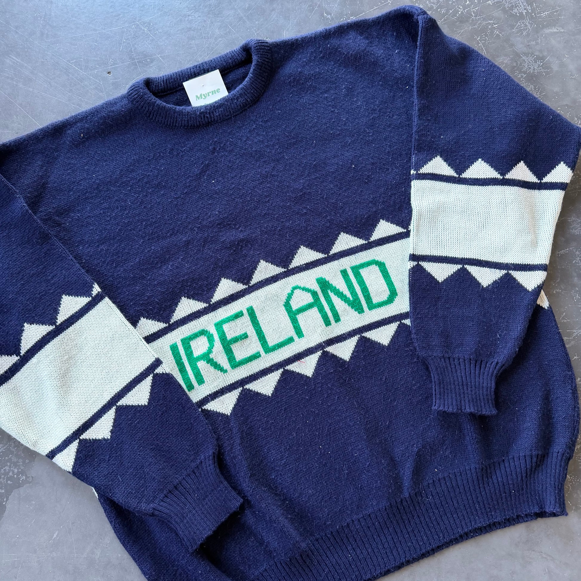 Such a nice sweater, navy with zig-zag patterning and green Ireland spellout on the front. Made in Ireland in the 80’s. In very good condition for its age, some small balling in places, but nothing major