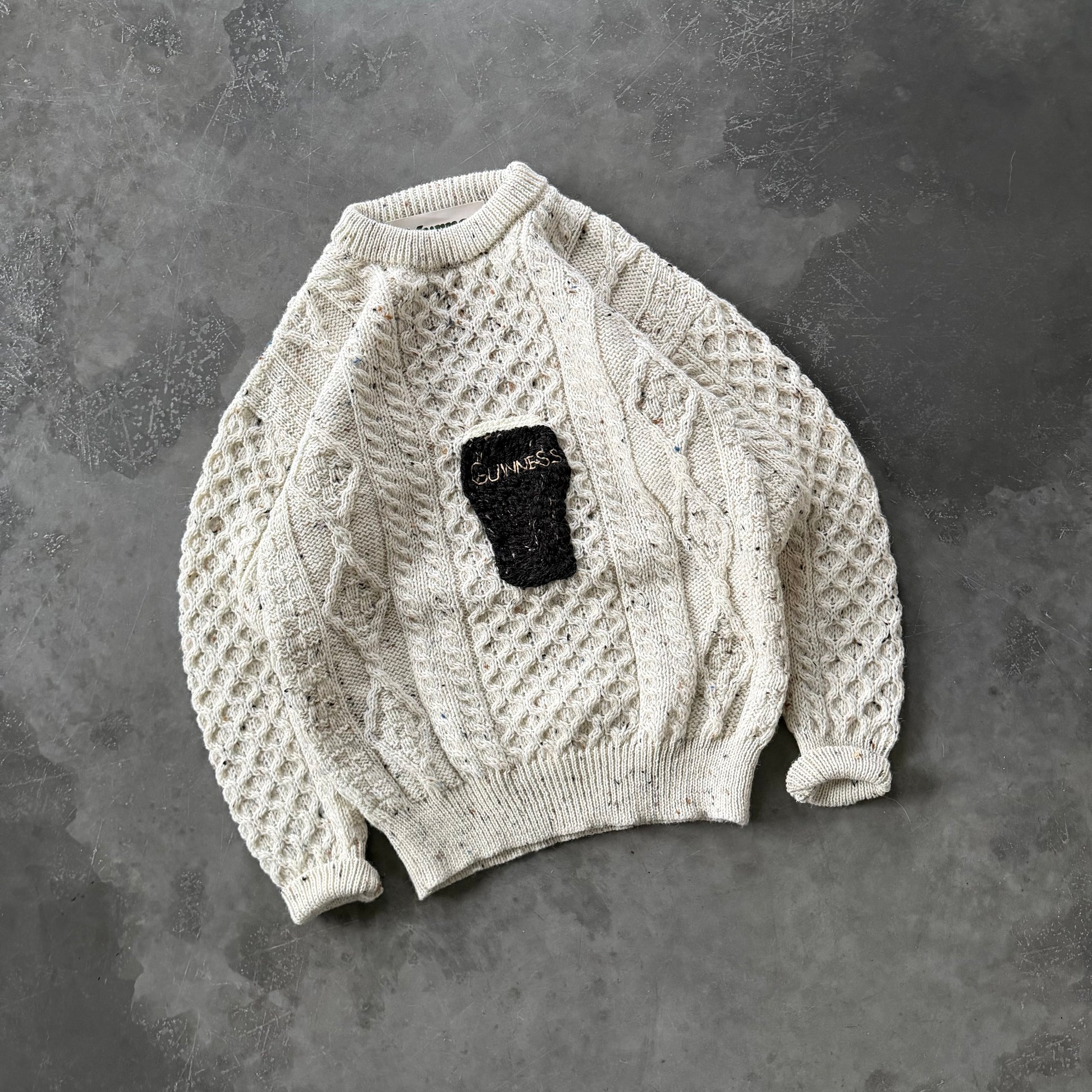 our pint geansaí’s are hand-embroidered by us onto 100% Aran wool sweaters. Each one is stitched by hand, no two are exactly the same.