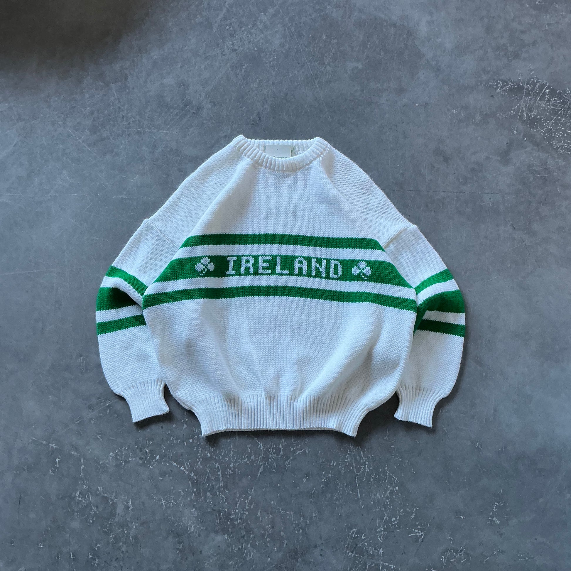 such a nice jumper, white & green colourway with Ireland Spellout and shamrock detail across the chest. In very good condition for its age. Acrylic wool and made in Ireland. Some small pulls but no major flaws. Lovely one overall